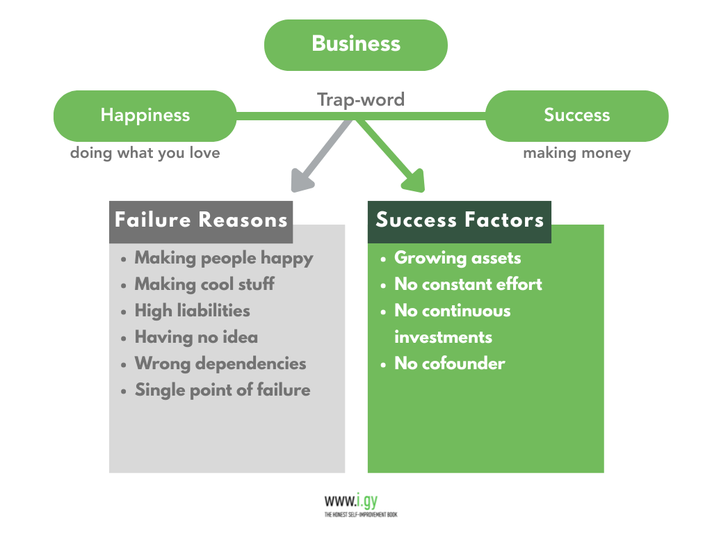 Keywords: assets, business, co-founder, customers, dependancies, Diversity of Experience, franchise, happiness, industry choice, investment, liabilities, money, partner, passive income, resources, single point of failure, scaling, success, time, Trap-word.