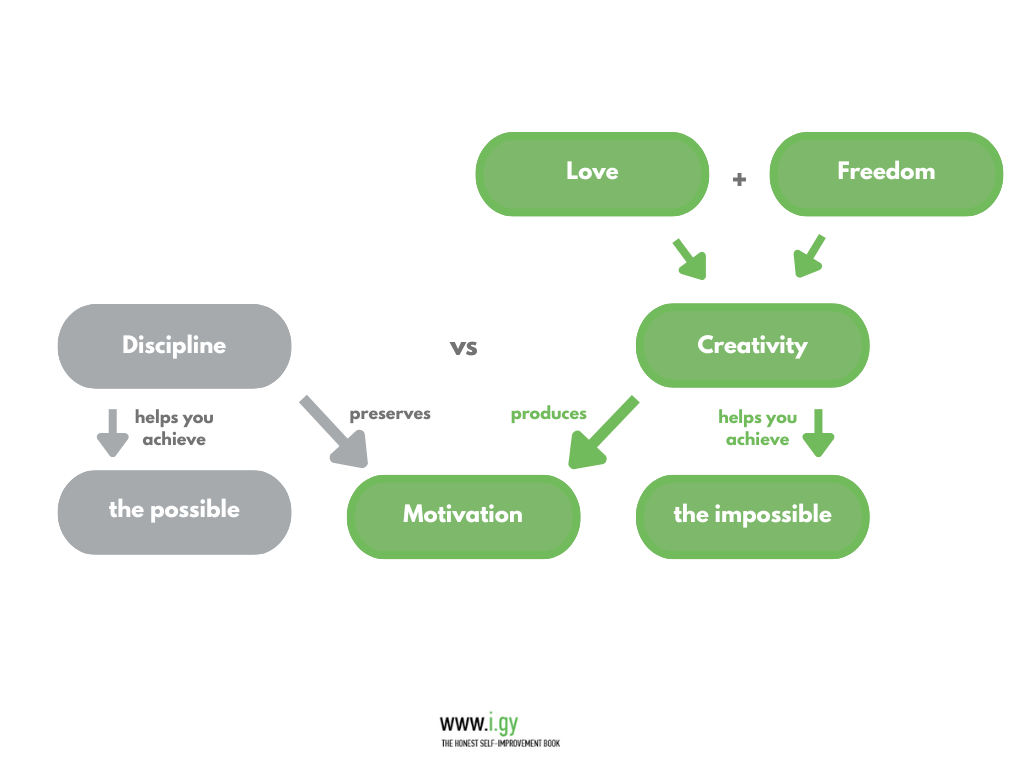 Discipline can be the result, but never the reason for creating anything of true value. Rules cannot create. They can only govern what is already in existence. Love and Freedom and their forms are the only creative forces in humans. And rules don’t add love and decrease freedom in the equation of creation. Discipline also can’t create new Motivation. Creativity is what creates new motivation. Discipline is admitting your losing trajectory but delaying the loss itself.