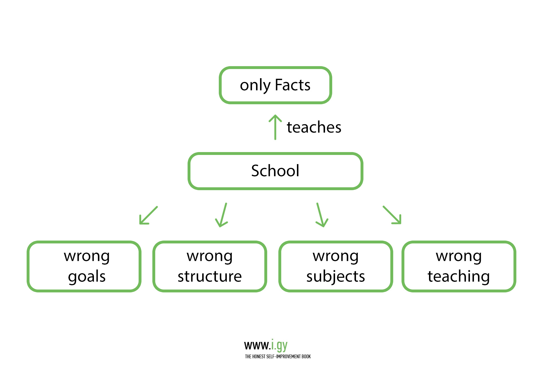 Nothing really important about life is taught in school. Instead we learn much more facts than we need. Facts are learned and forgotten. Children learn to think only in narrow fields, they don’t learn to make the connections needed to invent. Worse still, no one teaches us how to deal with feelings, emotions and our internal world.