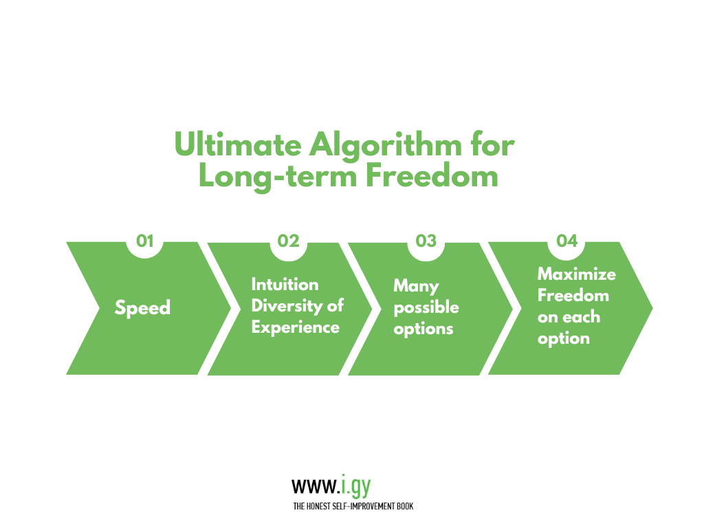 Considering every option possible requires extensive and practical Game of Life knowledge. It mostly comes from experience and the resulting intuition (but don’t ignore good education and mentors either). So from living at a faster pace and having more diverse experiences. Long term freedom is proportional to speed squared.