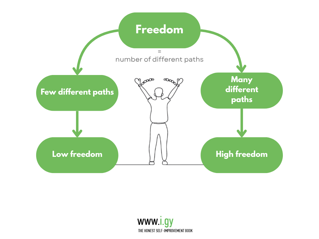 We define Freedom as how many meaningfully different paths you can take. Many different paths = High freedom. Few different paths = Low freedom. The constraints on freedom are in the Game of Self (our own abilities, fears and barriers) and in the Game of Life (our health, family and relationships, moral responsibilities and finances). Freedom is everywhere which makes it all-important as love and happiness.