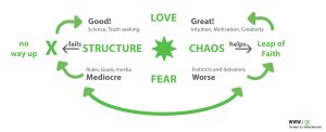 Compass of forces contains the human forces love and fear and the universal forces Chaos and structure. Chaos and love together lead to Intuition, motivation and creativity. Structure and love together lead to Truth. Structure and fear together lead to rules, rigid order, goals and inertia. Chaos and fear together lead to delusions. The only way out of fear is to make a leap of faith to love with the help of Chaos.