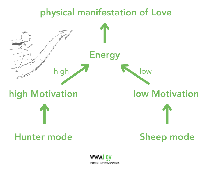 Energy depends on your Motivation. You are either in Hunter mode and motivated or in Sheep mode and unmotivated. Energy isn’t divided between work and life – it is a unified force driven by your motivation. Like a car that needs fuel, your body needs sleep and care.