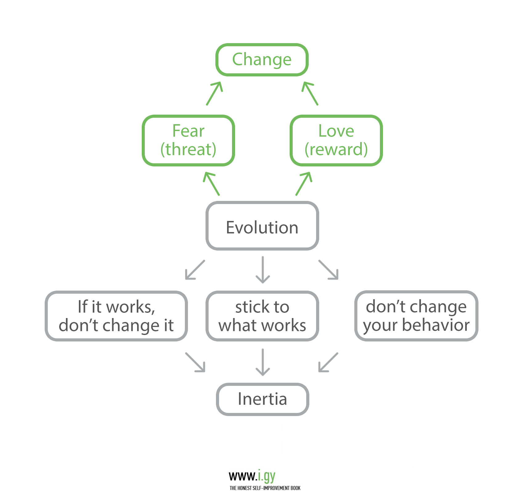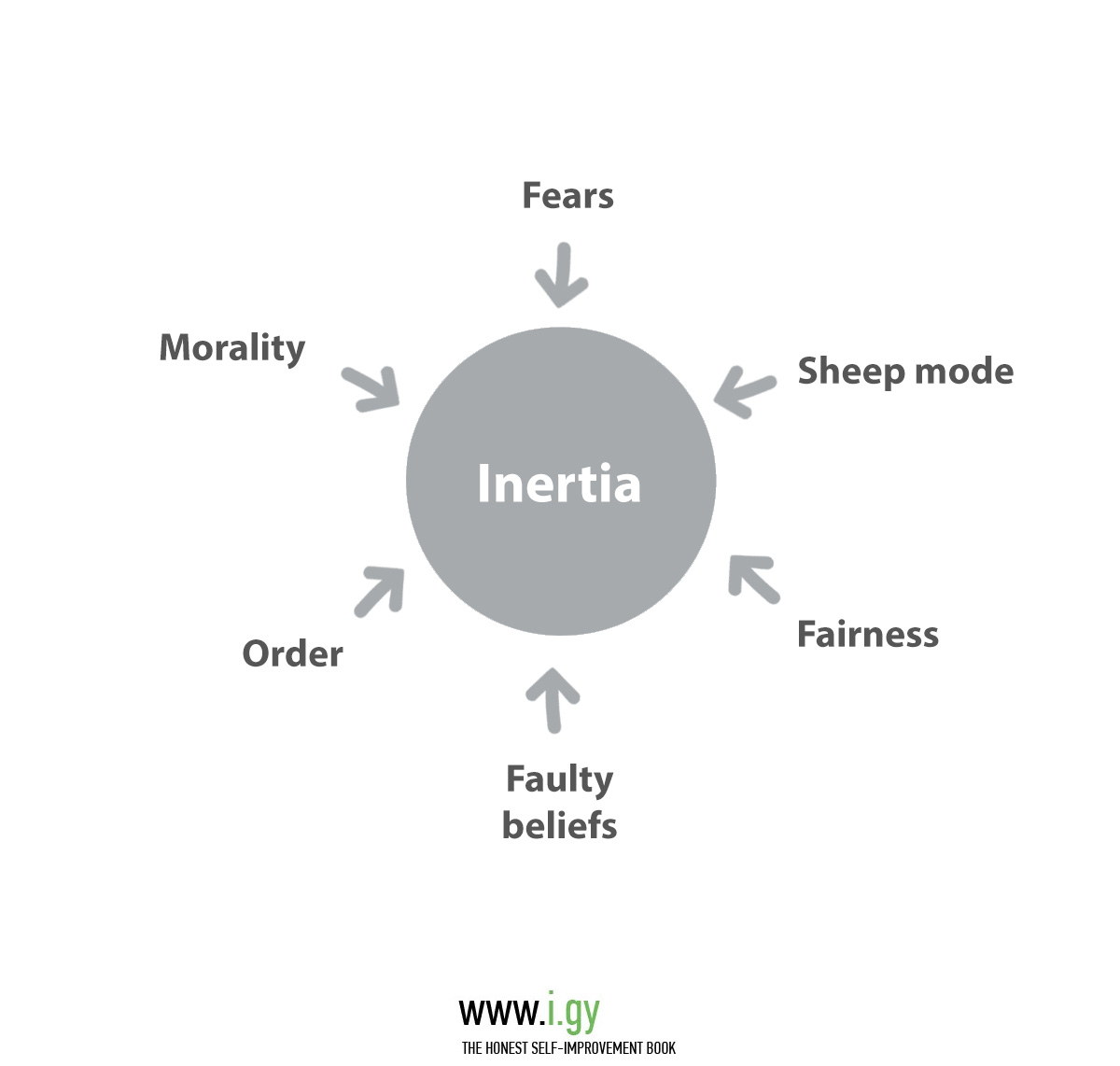 Living beings don’t really have a way to fully experience what lays ahead in time. Evolution’s plan to protect our future could only be executed in the present moment. So from every moment to the next, one evolutionary rule of behavior applies. If it more or less works, don’t change it. This is Inertia, the most constant force in your life.