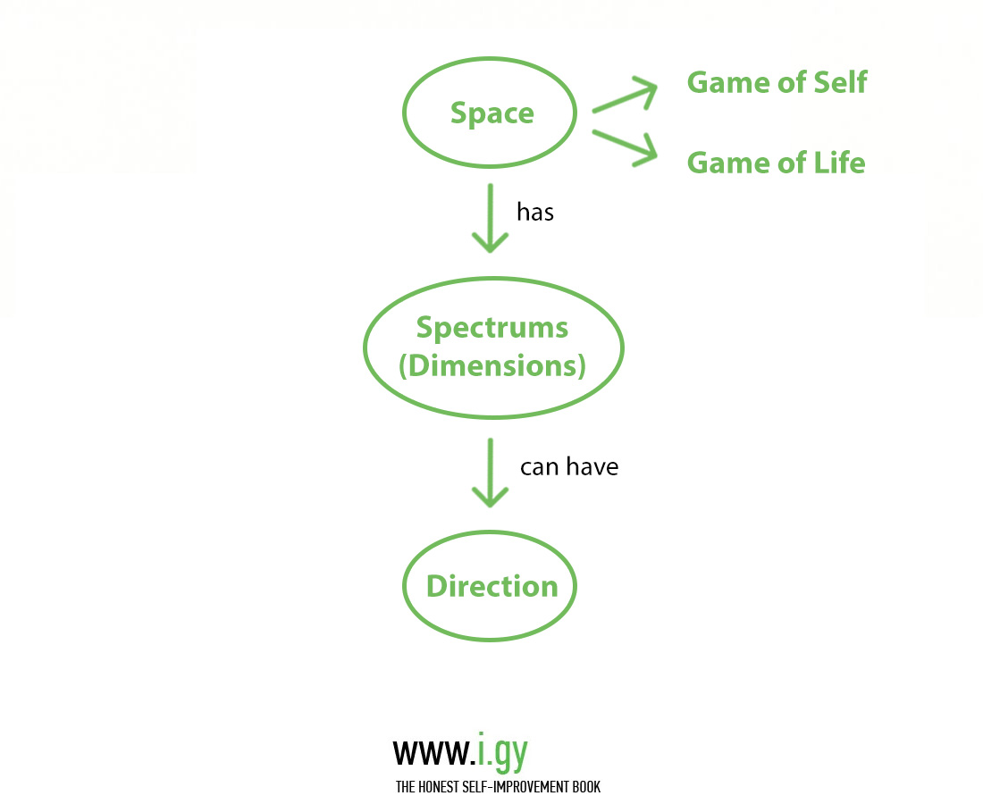 3. Spaces have Dimensions. Every dimension can have a direction, some inherent property that changes when you advance in this Direction.