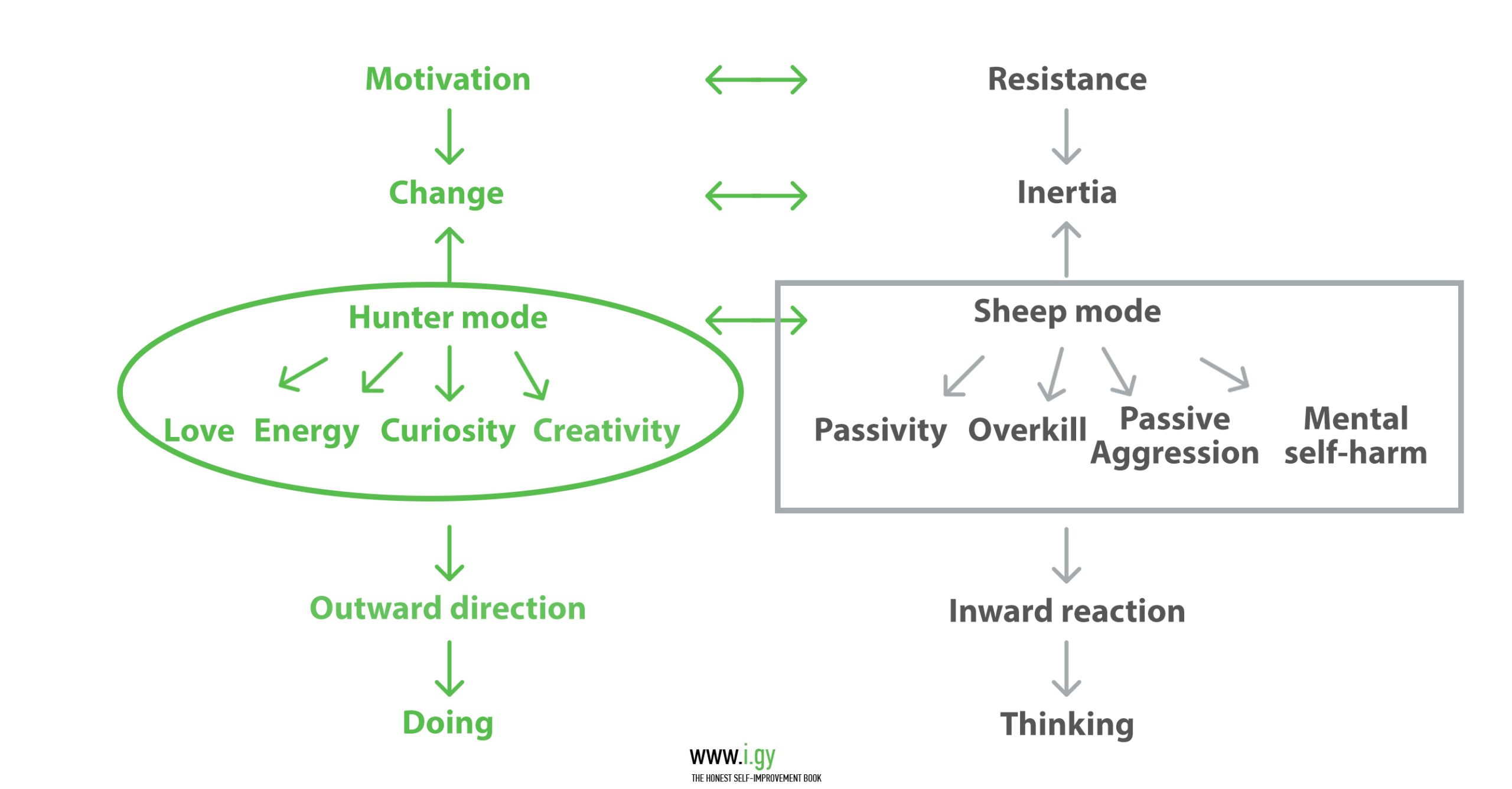 The Hunter-Sheep model defines two ways you can feel, think and act in – modes that set current life direction. When we act like a hunter, we’re being driven by love, its physical manifestation (energy), and its intellectual manifestations (curiosity and creativity). When we act like a sheep, we’re being held back by fears and inertia.