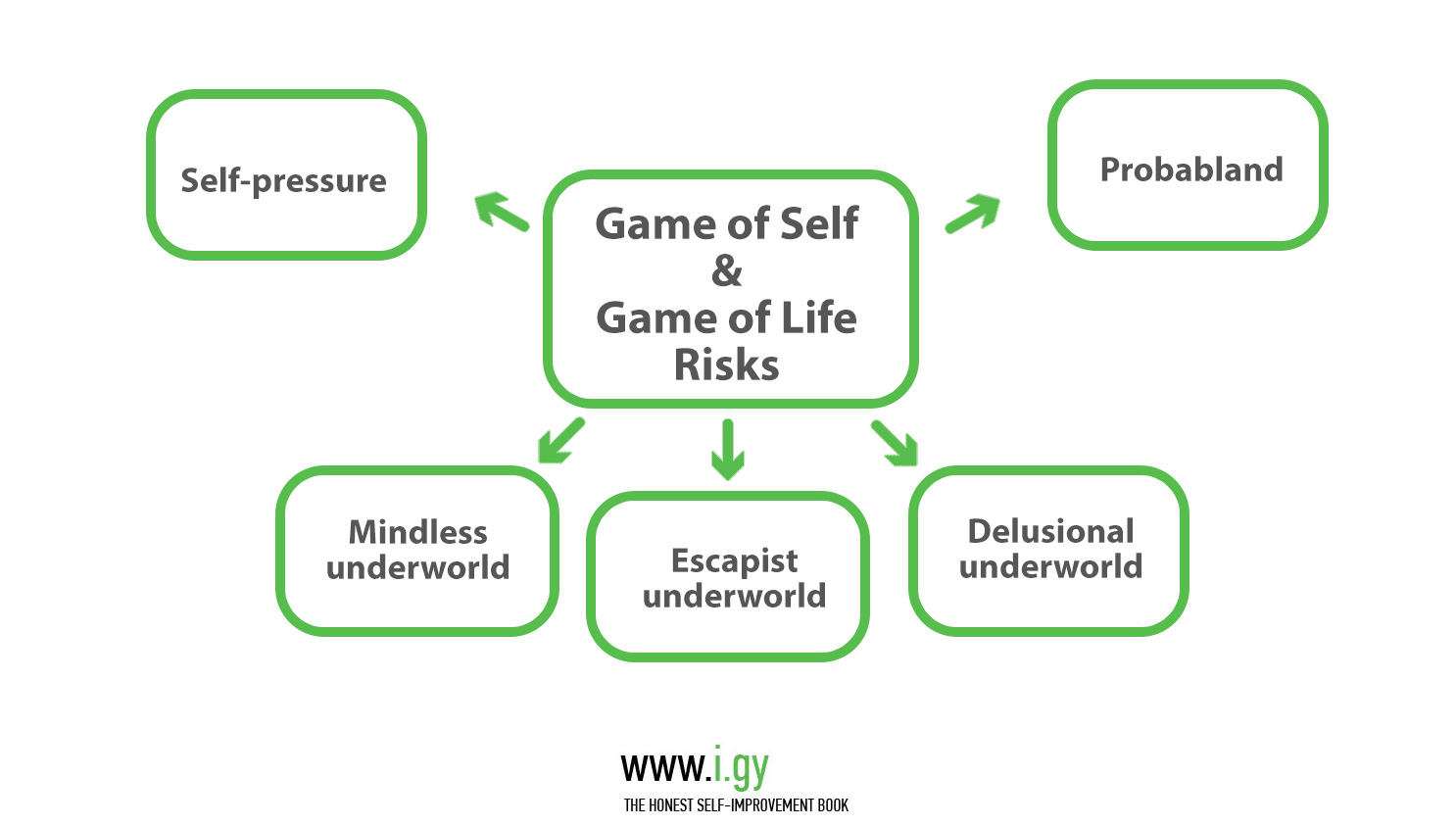 The Underworlds are a complex topic I’ll mostly leave to professional psychologists, focusing instead on the good stuff – our progress in The Game of Self and The Game of Life. Progress there will naturally decrease time spent in The Underworlds and the dreaded Probabland, therefore working for any people who haven’t already taken a dive too deep in their muddy waters.