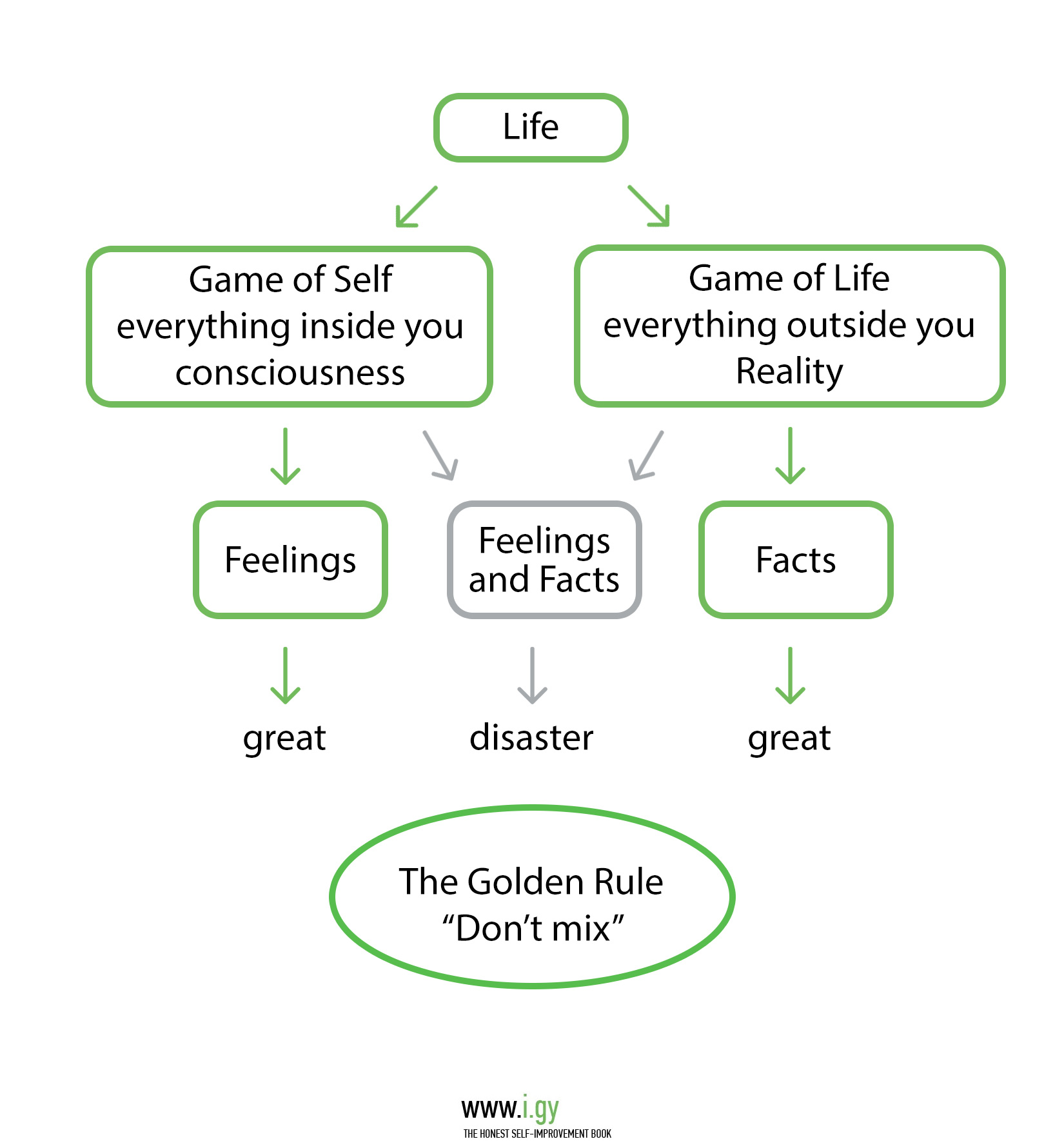 Mixing up the self and reality parts together is often paralyzing and can be the main reason people get stuck in life. You’ve heard of the golden rule not to mix facts and feelings in conflicts? It’s the same thing.