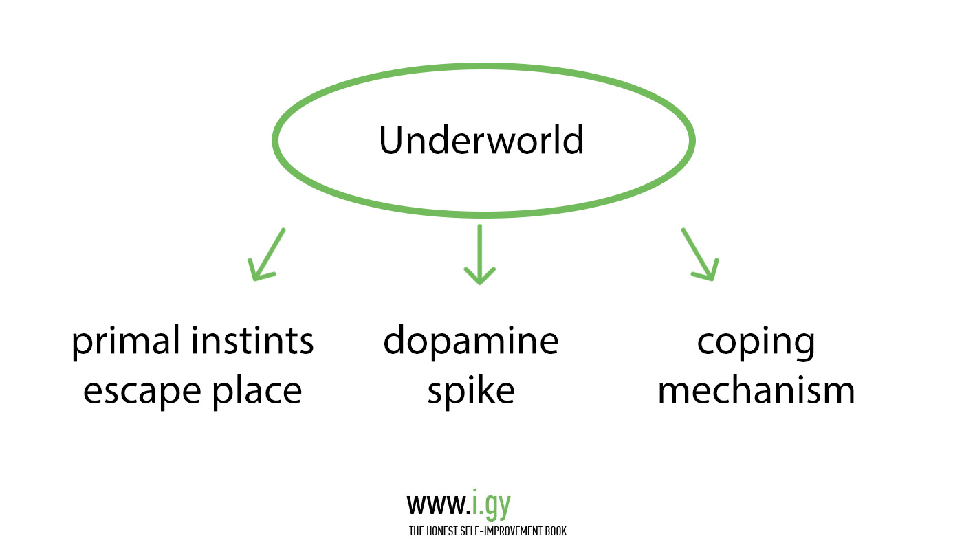 This powerful meeting point of reality and the self combines all the tempting places your primal instincts want you to escape to, in order to get a dopamine spike. Everything in the Underworld is a coping mechanism, helping only in the short term.
