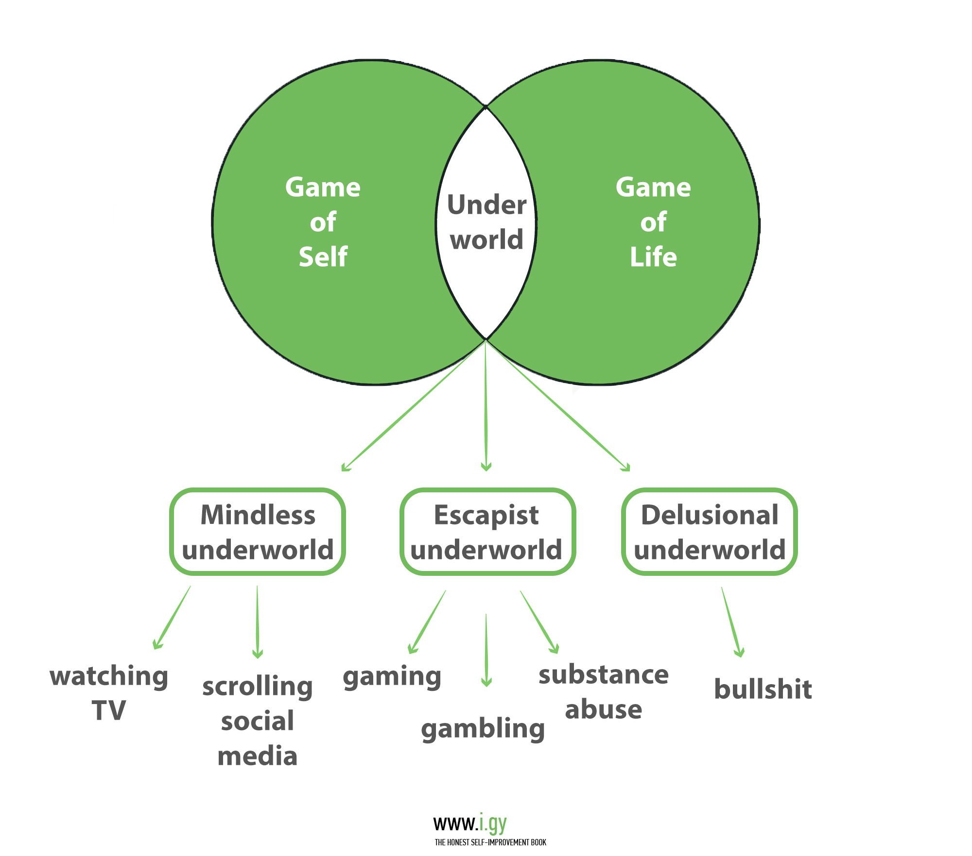 Of course, nothing helping you in The Game of Self or The Game of Life counts here. Reading a good book or watching a good movie is not in the Underworld. However, watching the news on TV, scrolling social media, or watching all of Friends for the 5th time alone is likely part of the Mindless Underworld. It’s true, watching shows you’ve already seen can decrease feelings of anxiety, but so can reading a book, exercising, meditation, and these don’t contribute to Sheep mode, unlike the Mindless Underworld.