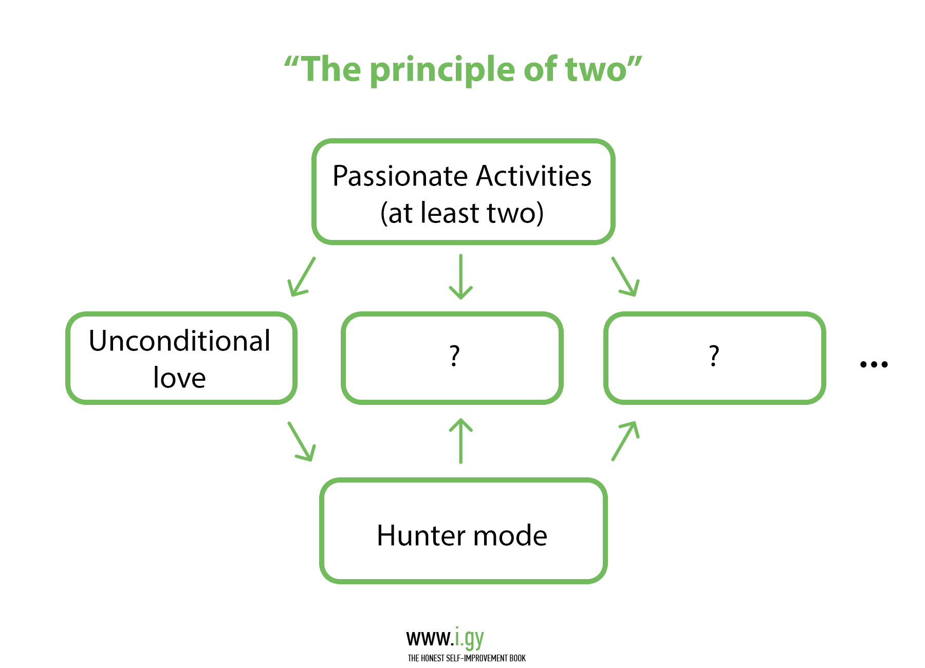 Feeling Unconditional love is one passion. If you don’t have another, you risk leaning into obsession. “The principle of two” states that at any point you need at least two very passionate activities in your Game of Life.