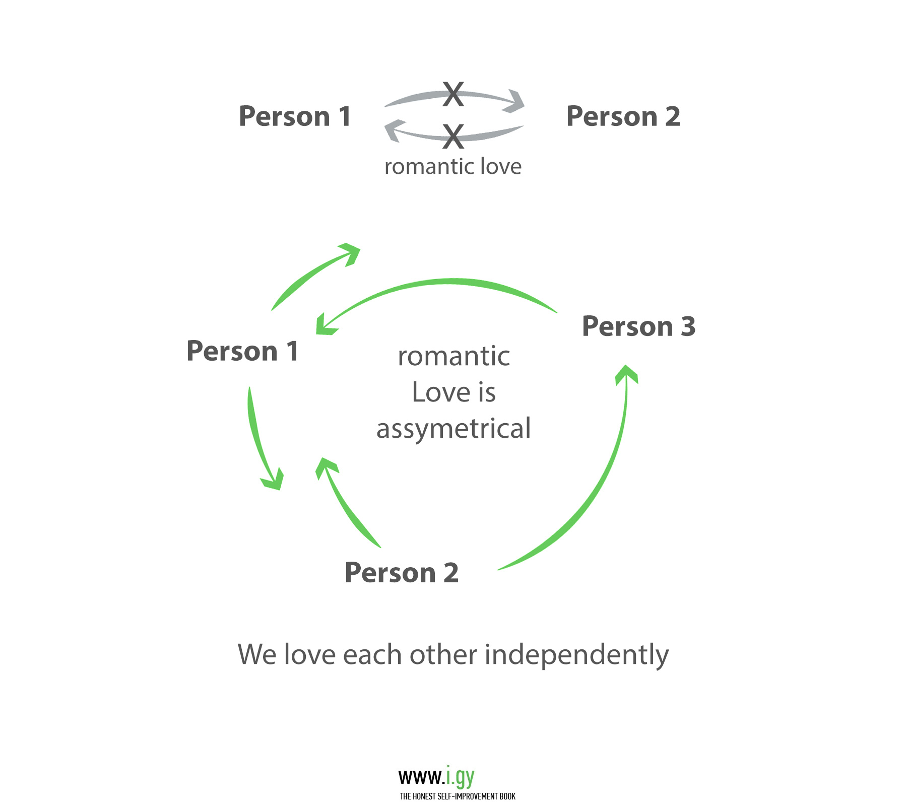 - Romantic love should not be regarded as something between two people because it’s asymmetrical by nature. A much more realistic picture is of you loving each other independently. The strength, depth and exact mix of feelings are never the same.