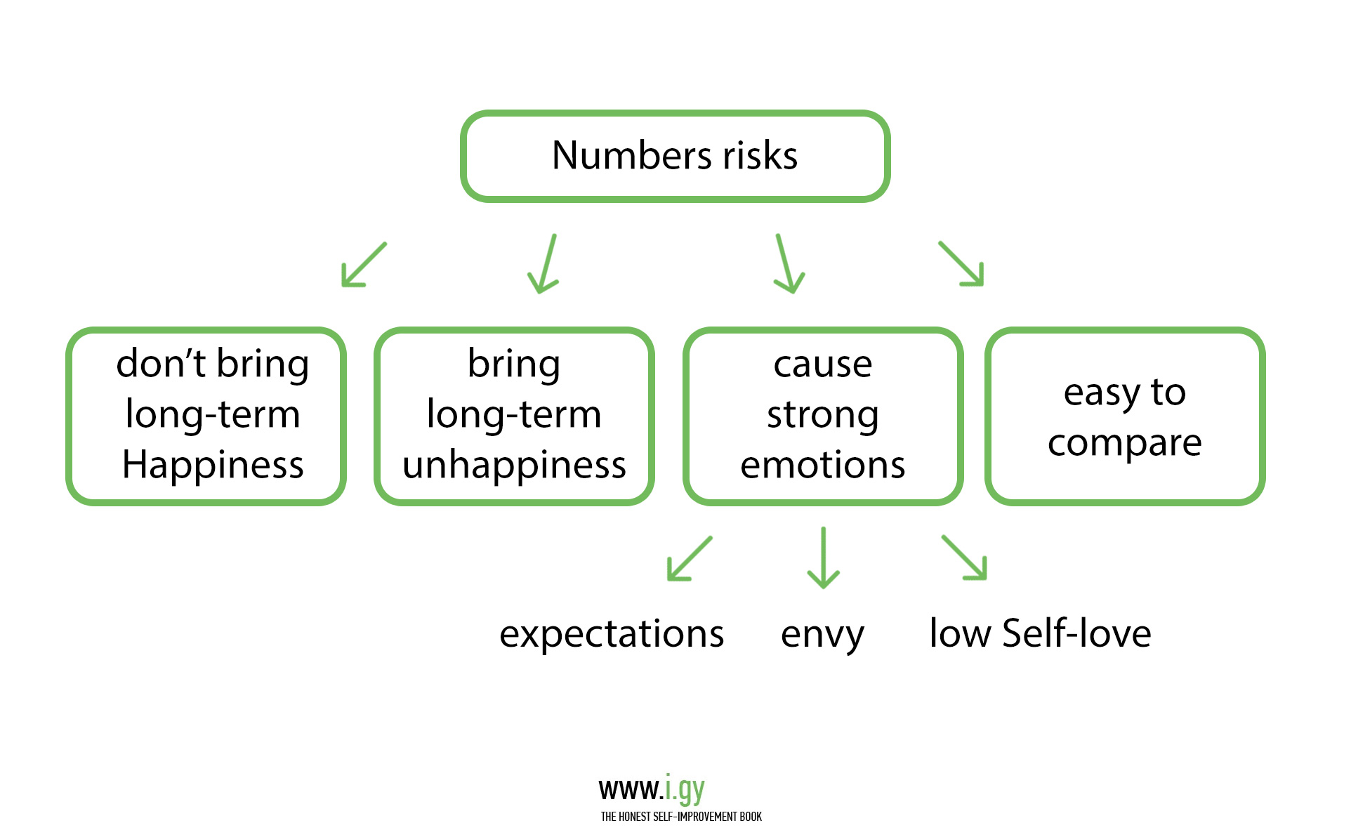 Numbers can bring long-term unhappiness – This mostly happens when envy poisons a life, and is often observed in reality. A main source of envy is numbers, especially money and achievements.4