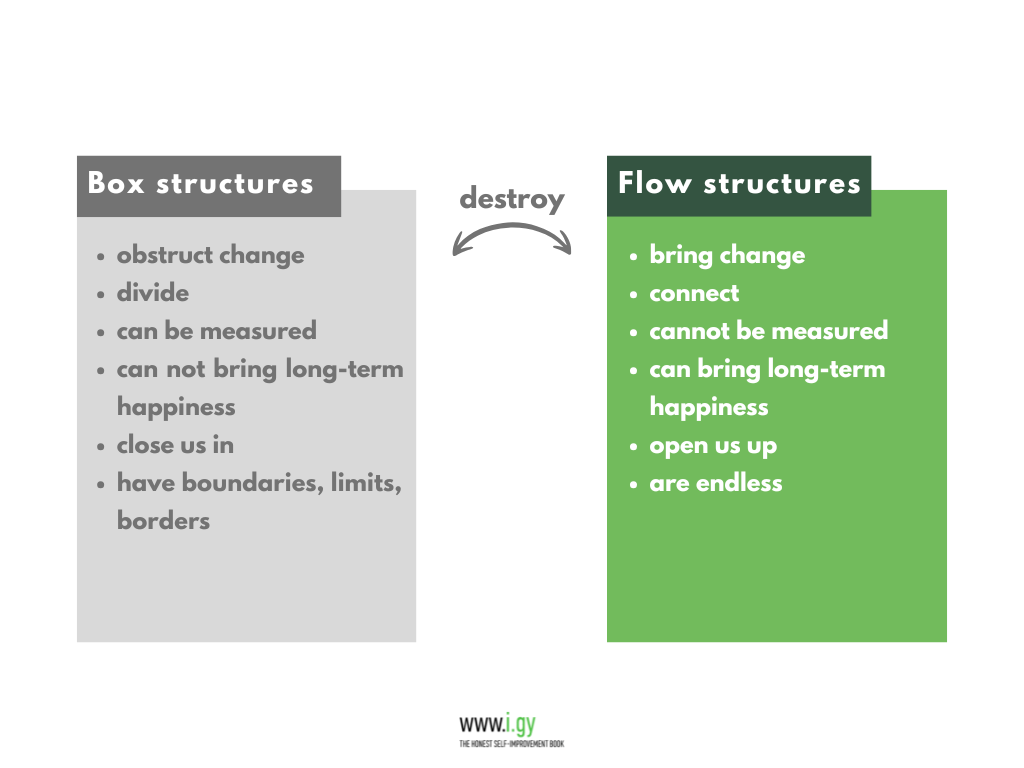 Boxes cannot bring true long-term happiness. Flows can. The very definition of these structures tells us which are good and bad for us. Flows open us up. Boxes close us in.