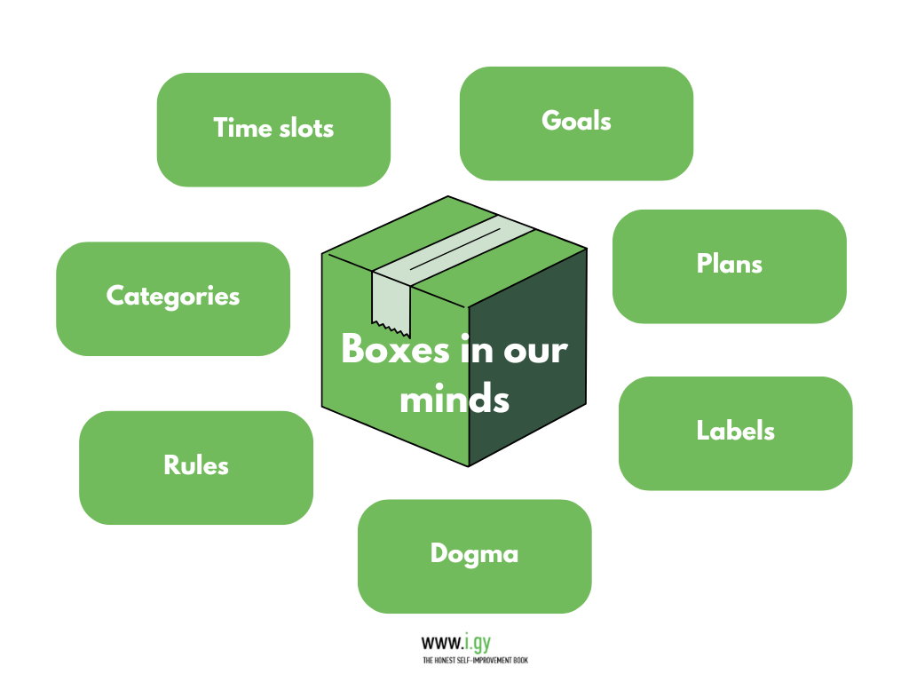 Without flows even if you quit the job, you’ll end up in a similar one (another box). Even if you break up, your next partner is very likely to be similar (another box). Only flows improve things and true letting go is not exchanging one box for another. It’s embracing flows and ditching all possible boxes.