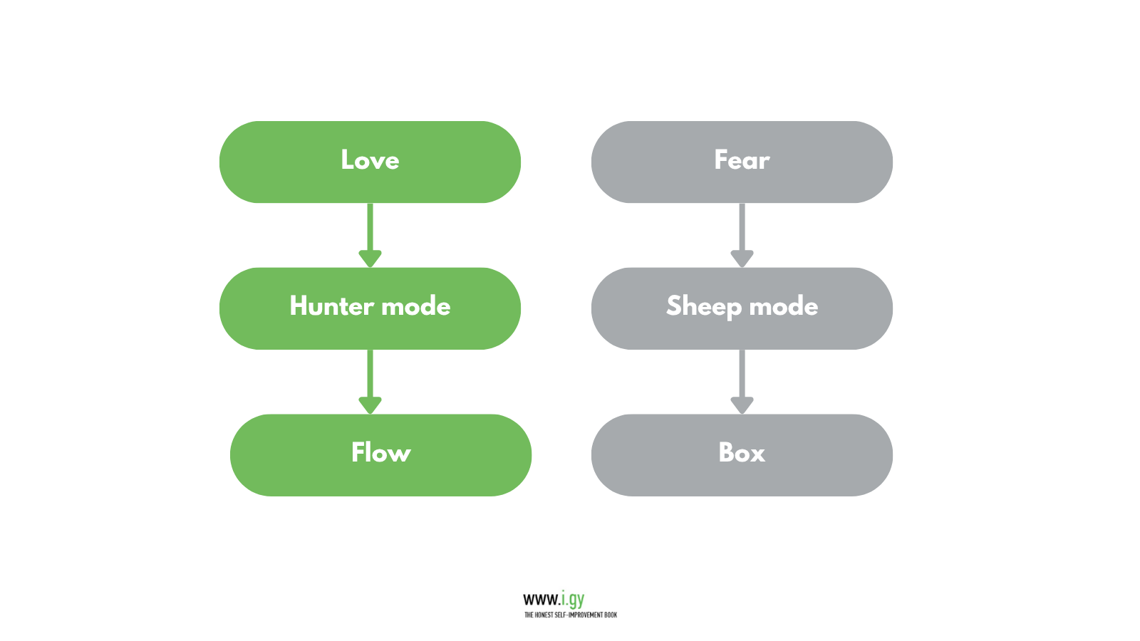 Hunter mode + Flow thinking and Sheep mode + Box thinking are the two typical states you can find yourself in. And you already know which one you need for happiness and progress. So let’s construct an environment stimulating Hunter mode + Flow thinking.