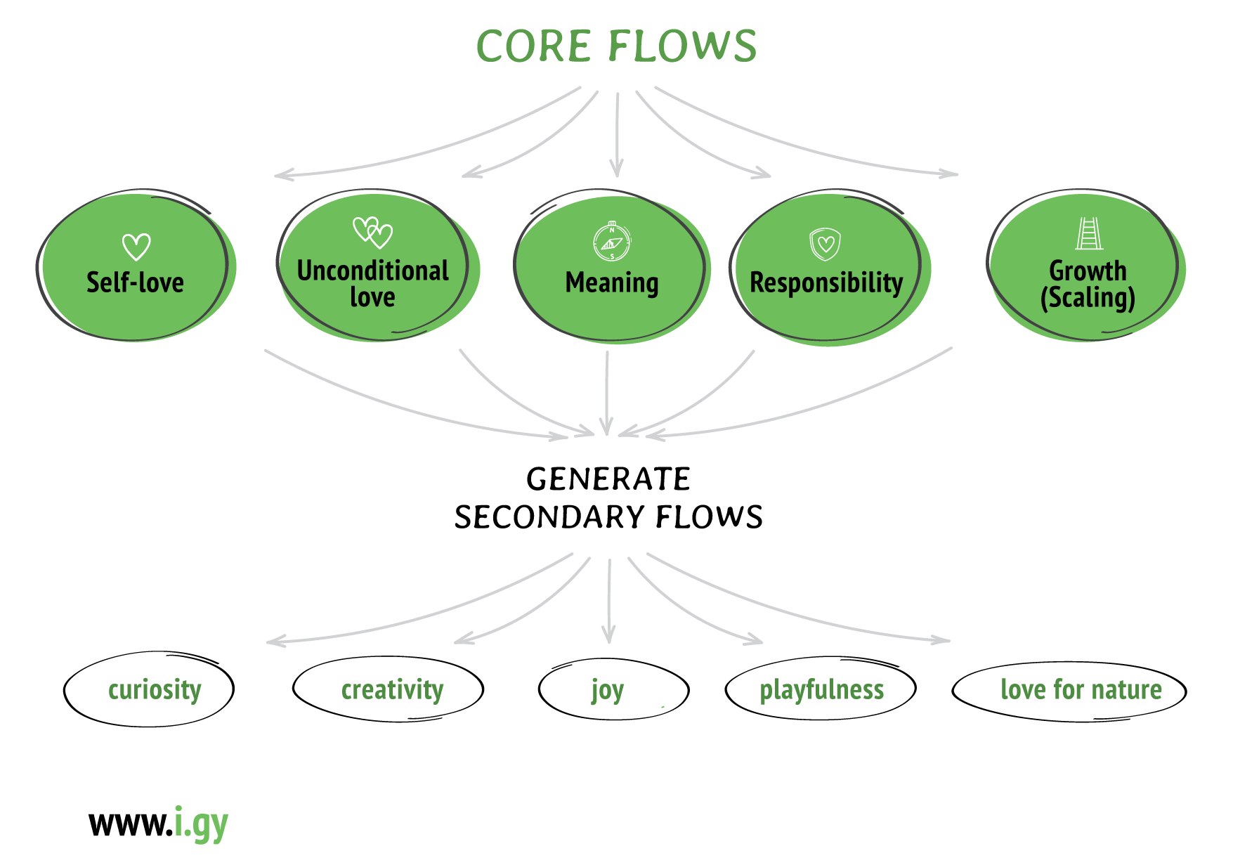 The core Flows generate secondary Flows such as curiosity, playfulness, joy, love for nature and creativity.