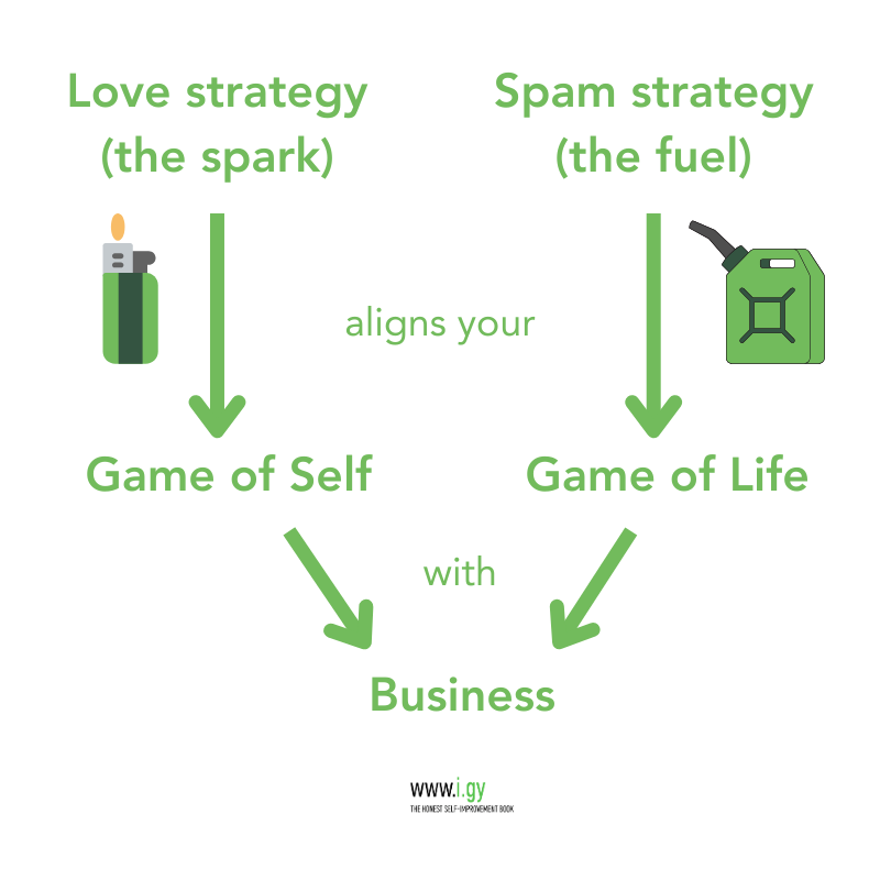 Love strategy (the spark) aligns your Game of Self and Spam strategy (the fuel) aligns your Game of Life with Business.Here are two crazy-enough-to-be-great strategies that each cover the respective Game of Self and Game of Life sides of scaling from zero to one. They combine perfectly, too.