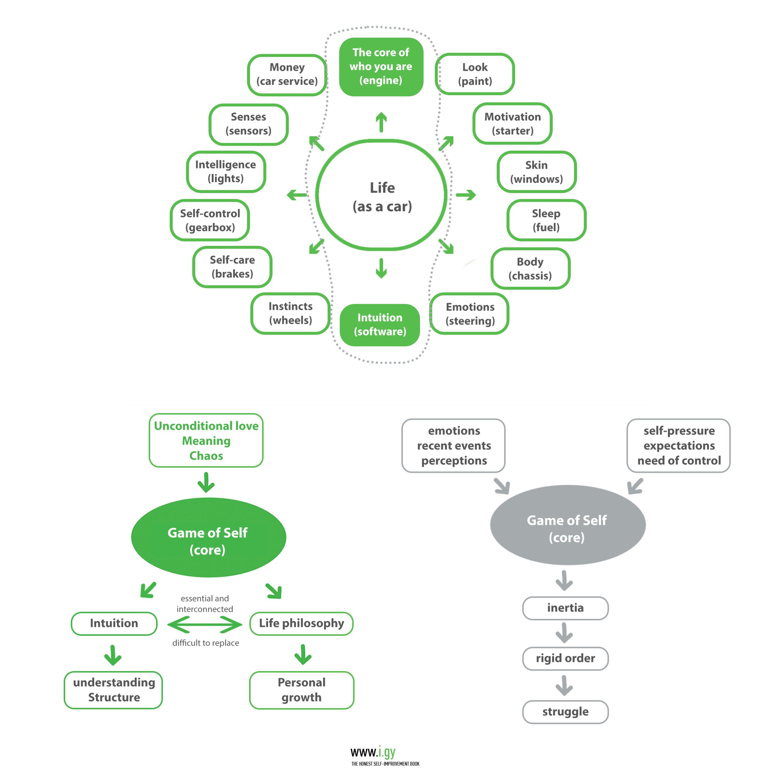 Life is a complex machine. While we may not have the complete owner’s manual, we can gain valuable insights by exploring its components. Let’s project the building blocks from life into the building blocks of a car: engine (the core of who you are), starter (Motivation), fuel (Sleep), chassis (body), steering system (emotions), wheels (survival insincts), brakes (self care), gearbox (self-control), lights (intelligence), paint (look), windows (skin), software (Intuition), sensors (senses), the car service (Money).
